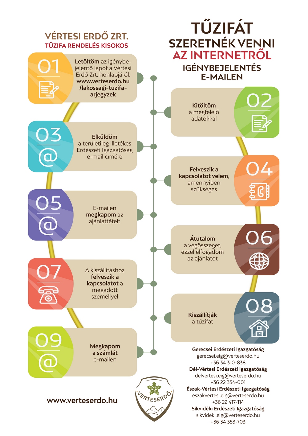 Az igénybejelentésnek tartalmazni kell a megvásárolni kívánt termék megnevezését, melyet honlapunkon, a lakossági tűzifa árjegyzék menüpont alatt (https://verteserdo.hu/lakossagi-tuzifa-arjegyzek/) megtalálnak, az igényelt mennyiséget és a kiszállítási, kiszolgáltatási cím pontos meghatározását, valamint az igénybejelentő elektronikus, illetve telefonos elérhetőségét.