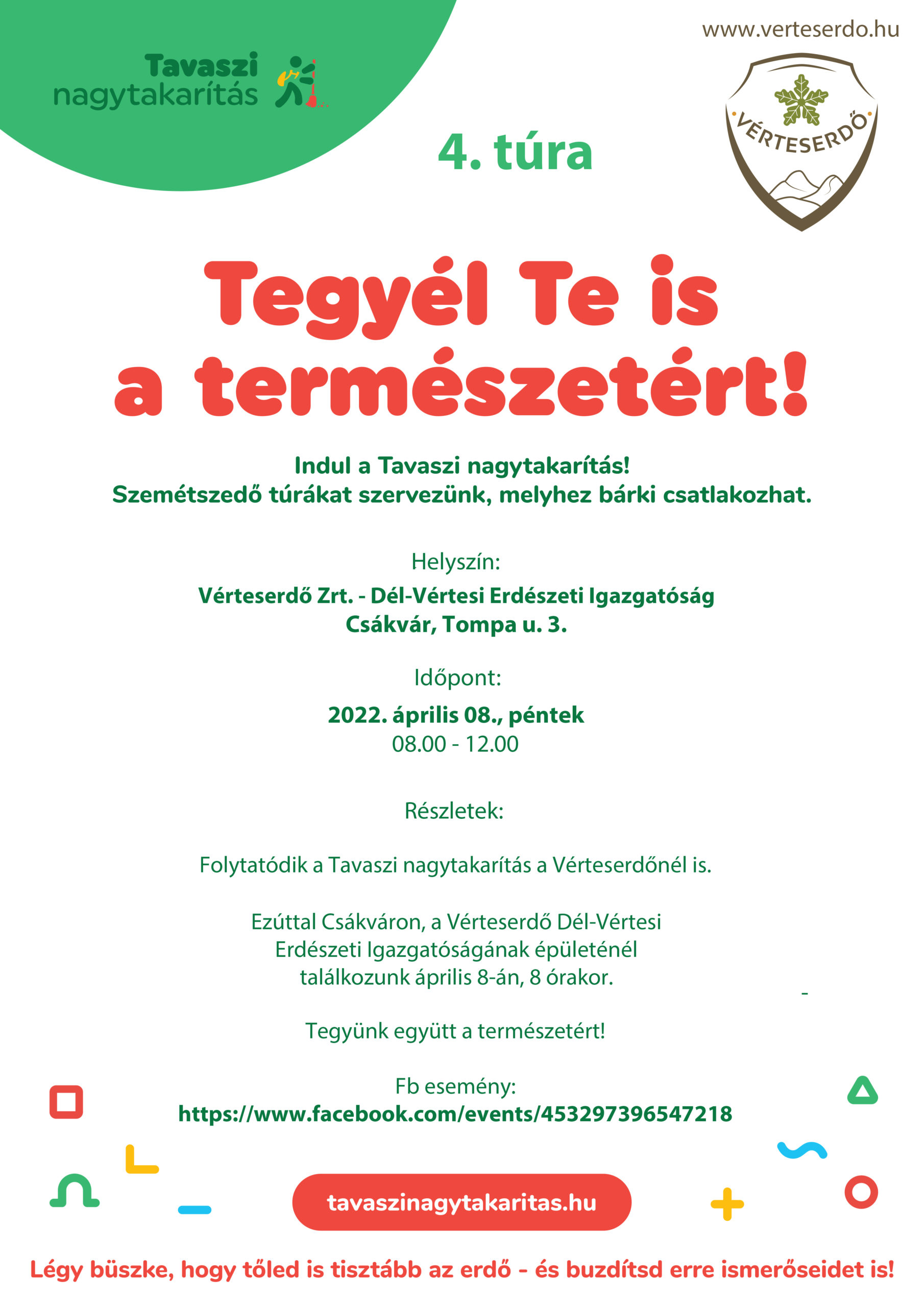Az Aktív- és Ökoturisztikai Fejlesztési Központ (AÖFK) tavaszi nagytakarításra hívta a kirándulókat, erdőjárókat, túrakerékpározókat. A „Tavaszi nagytakarítás – Takarítsuk ki a természetet együtt!” akció március 21-én az Erdők Nemzetközi Napján indult és egészen április 22-ig, a Föld napjáig fog tartani. A kezdeményezéshez idén csatlakozott 17 állami erdőgazdaság – természetesen köztük a Vérteserdő Zrt. is -, 6 nemzeti parki igazgatóság, az Innovációs és Technológiai Minisztérium (ITM), számos önkormányzat és civil szervezet. A kampány kettős céllal indult útnak. A szervezők egyrészt szeretnék szemétszedő túrákon megtisztítani a kedvelt kirándulóhelyeket, másrészt pedig az erdőjáráshoz kapcsolódó etikettet kívánják megismertetni a nagyközönséggel.