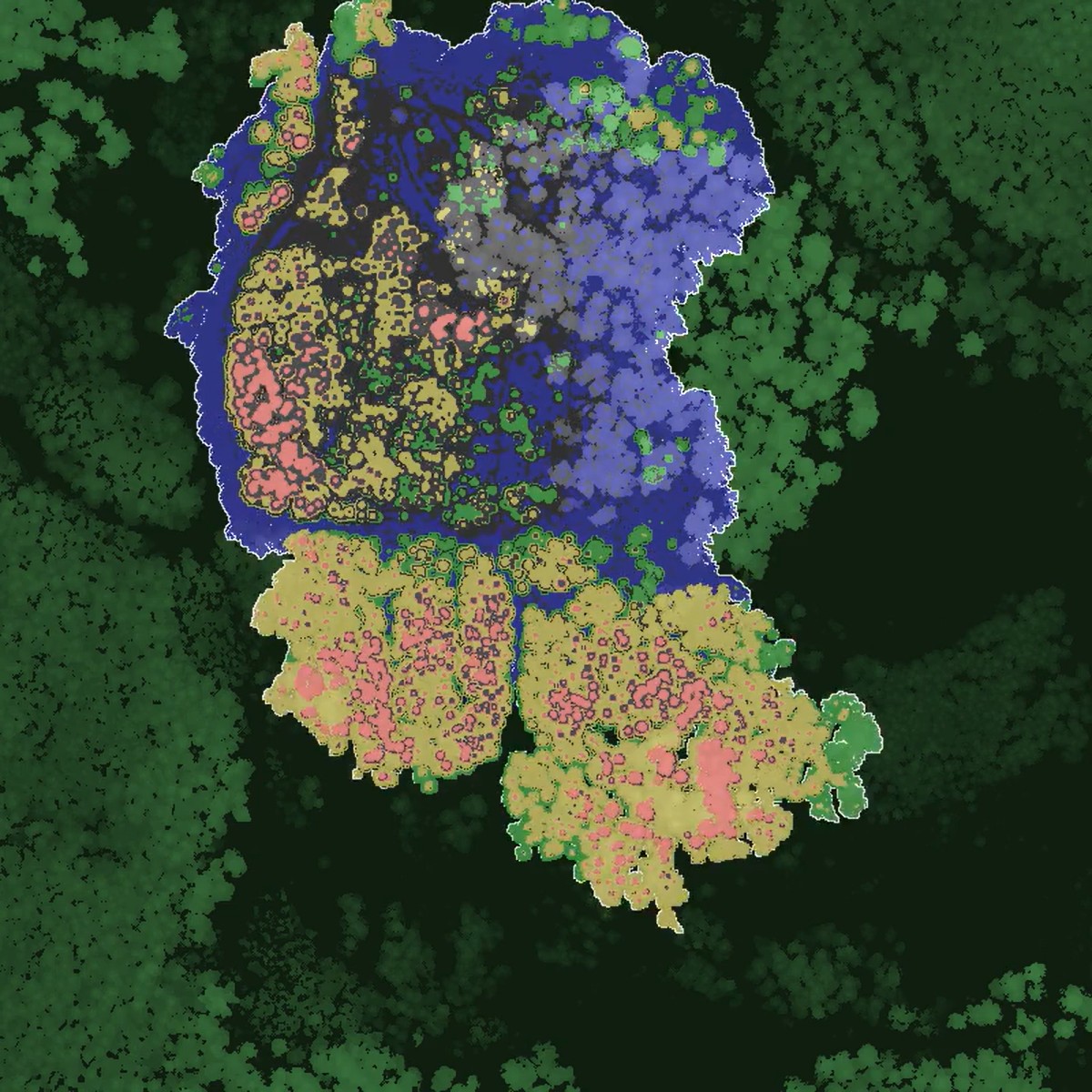Tűz terjedésének modellezése – Vertikalitás – 4 réteg elkülönítése: kék: 0-3 méter, zöld: 3-8 méter, sárga: 8-16 méter, piros 16 méter fölött